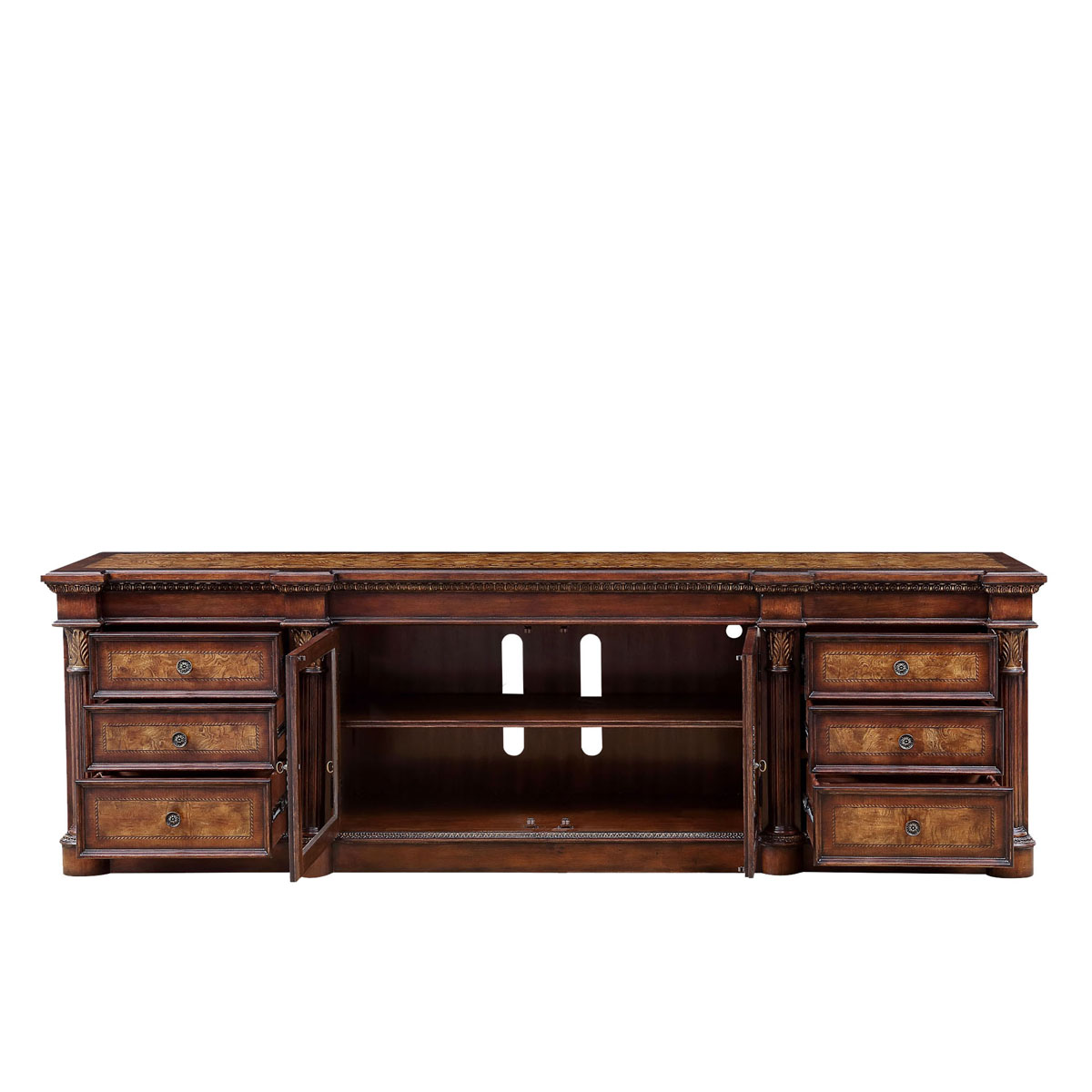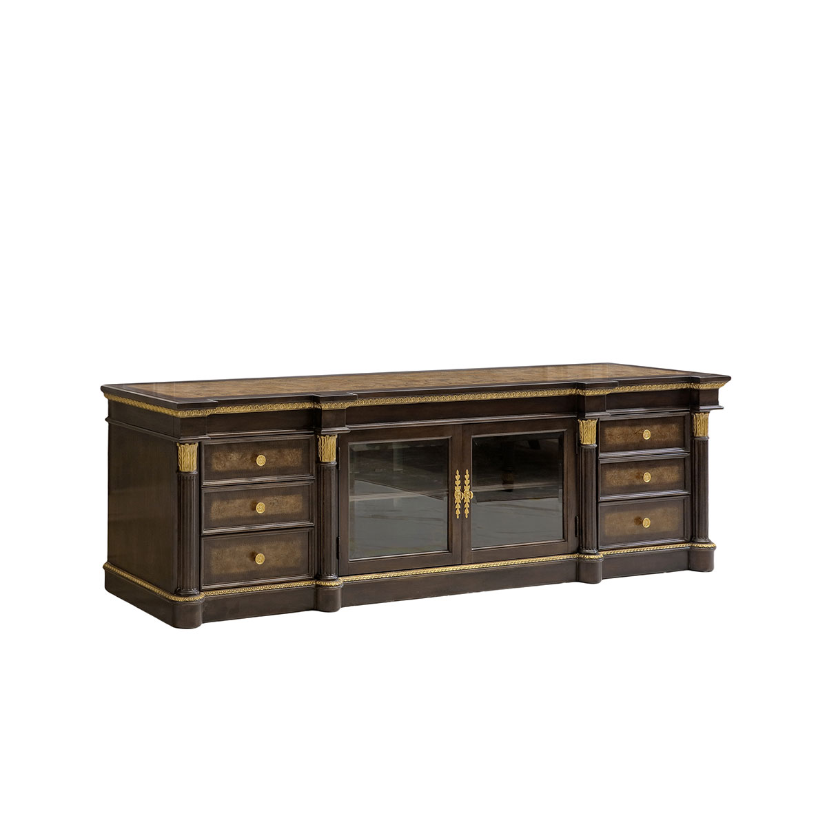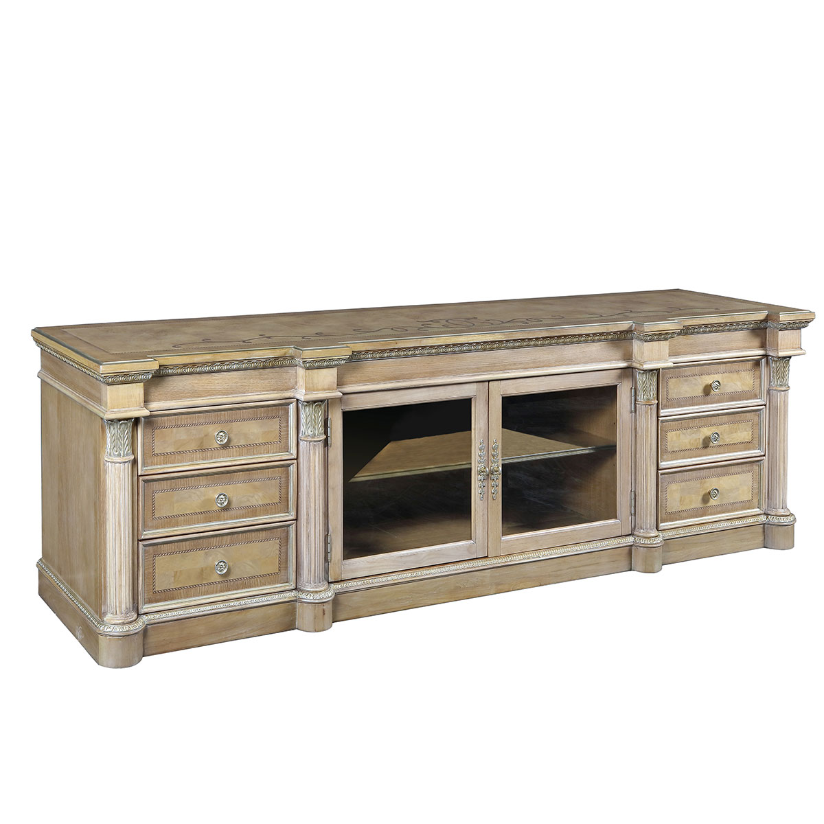 * 仿金箔工艺配上精细的雕刻工艺 * 六个储物抽斗,左右两边底下抽斗配有CD/DVD隔板,可将CD/DVD更好的存放,中间门内各一块可调层板;