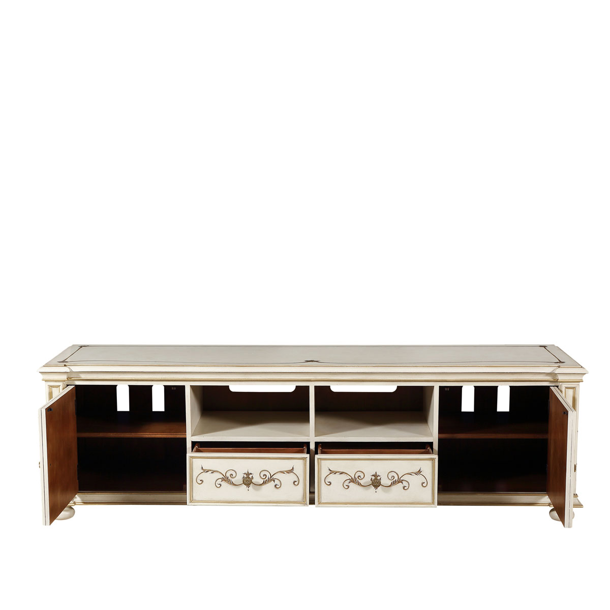 * 中间两个储物抽斗配有CD/DVD隔板,可CD/DVD更好的存放,其底部采用经典硬木实木滑轨设计; * 两扇门内各有一块可调层板;上部为开空设计,可在内放播放器等电子器材; * 脚底部装有可调脚钉;