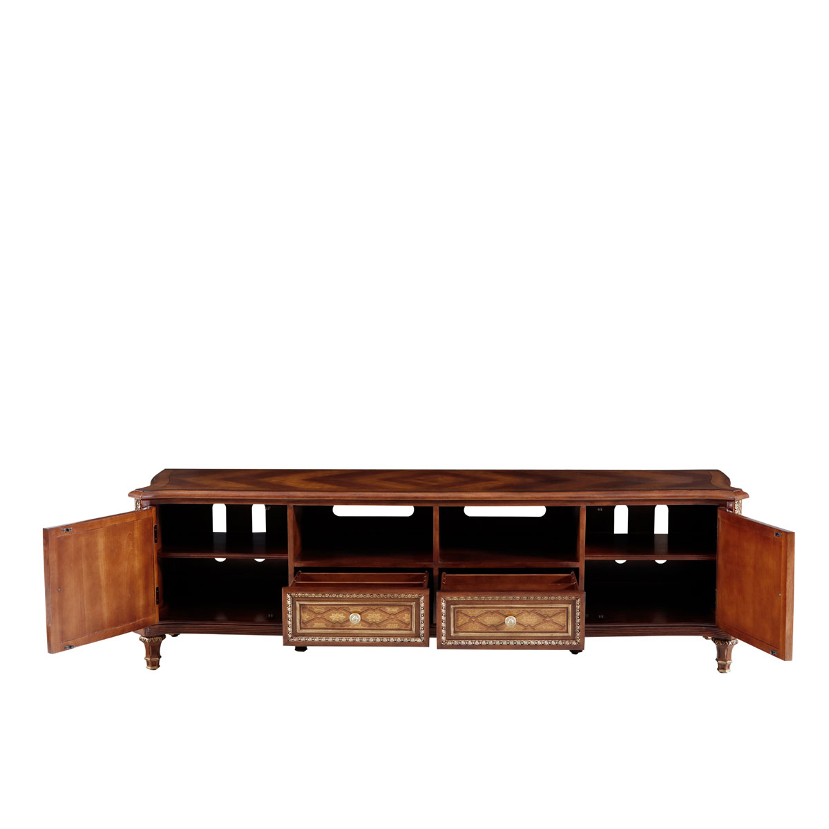 凡尔赛玫瑰电视柜 以 Louis路易时期 Bombe Chest(邦贝柜)新古典风格为设计灵感,多种珍稀木皮贴饰成的木皮拼花清晰美观,斗面镶嵌路易十四太阳王的“L”字图腾雕刻,沐浴着太阳之光象征王权荣耀,