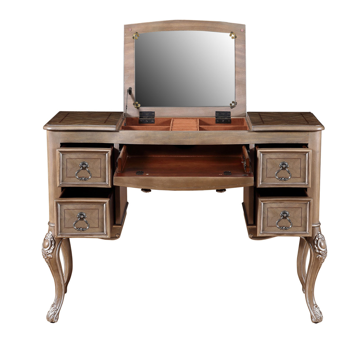 * 四个储物抽斗,底部采用硬木实木滑轨.中间抽斗的设计可翻下斗面,用来放置键盘,抽斗内侧有电线孔,抽斗两边装有两条三节消声铁滑轨,滑顺耐用; * 中间面板可打开,里面有镜子和绒布戒指格; * 脚底部装有可调脚钉