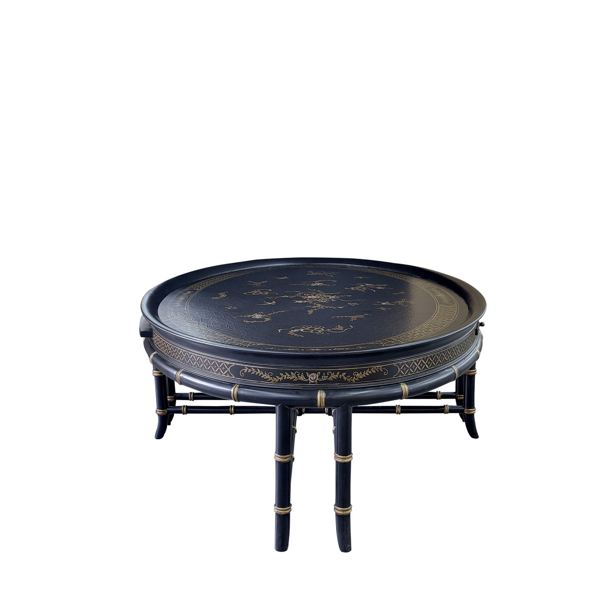 * 精美的手工彩绘图案,来自东方意念的植物图案搭配高贵的黑底金漆;配上托盘式面板设计,是经典系列圆咖啡桌的一大特色。