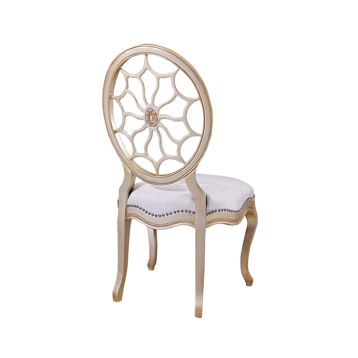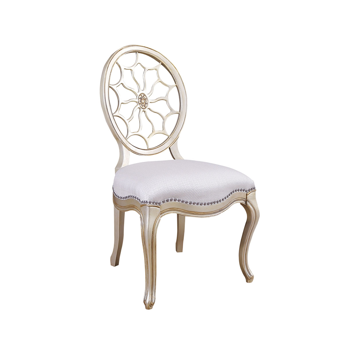 * 参考乔治三世时期的古董造型设计,使用轮子构造椅背和安妮王后腿,配以精致的手工雕刻细节和涂金工艺、布艺面料和厚实柔软的填充物,是豪华系列凡尔赛玫瑰法式单椅的特色。