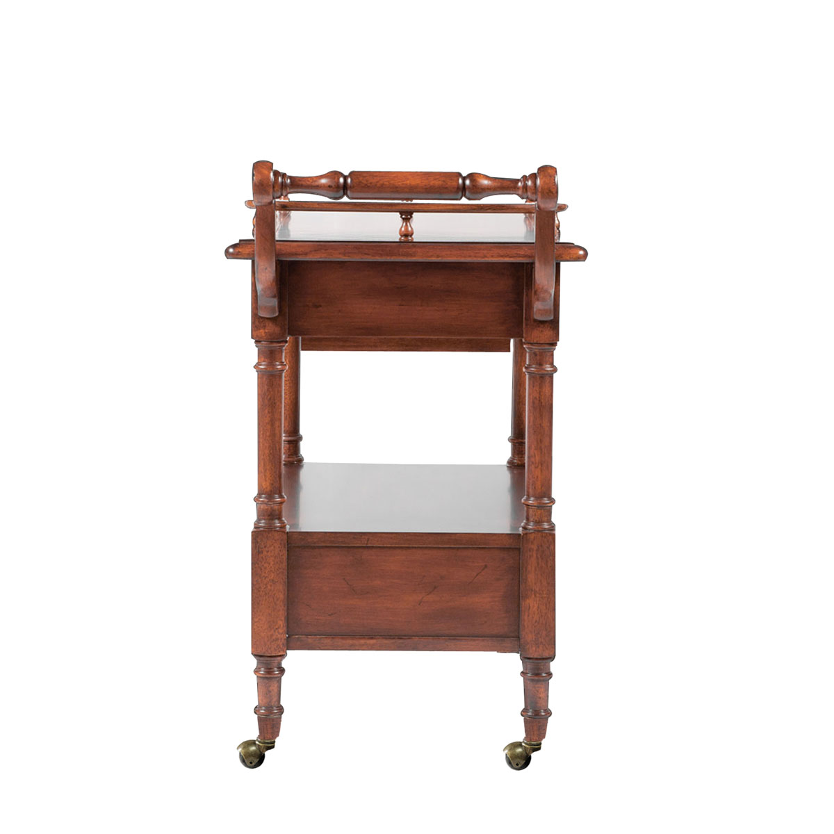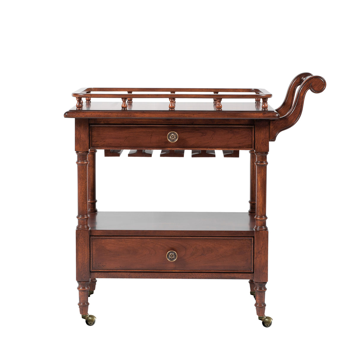 * 二个储物抽斗,底部采用经典的硬木实木滑轨 * 顶上有护边带推手,底下带脚轮,中间带挂酒杯的木制瓶架;