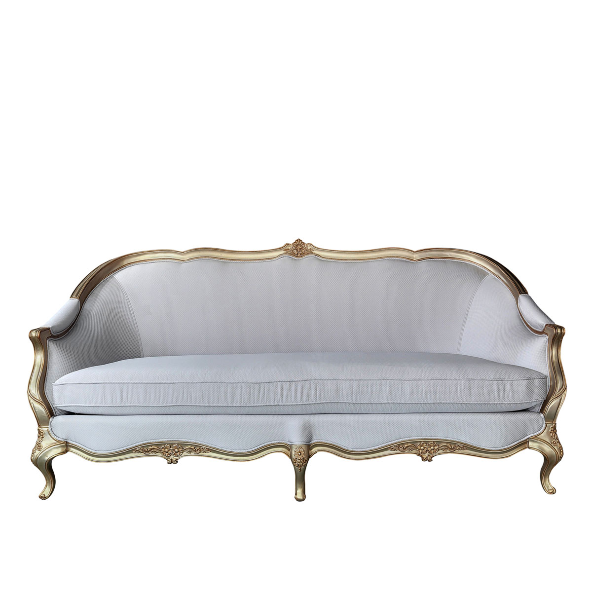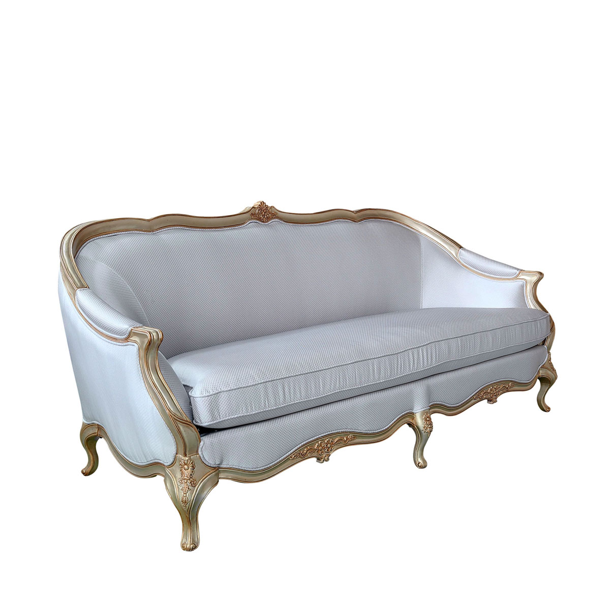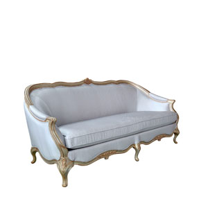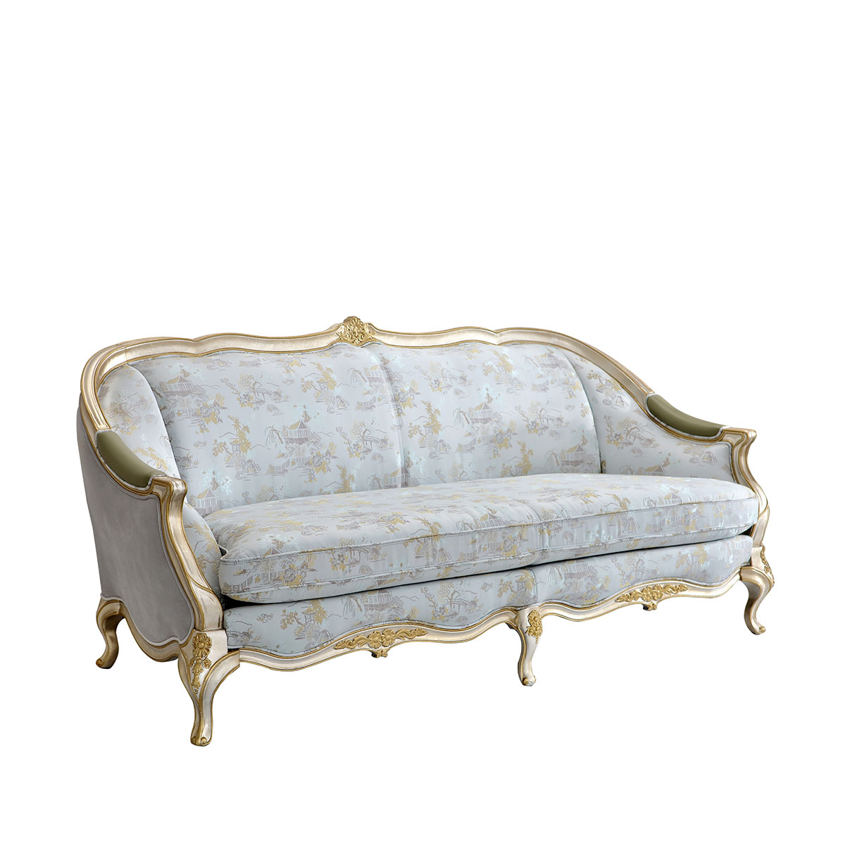 * 从法国十八世纪初摄政时期的风格中汲取灵感制作而成,采用了同风格的弯脚设计,阿坎瑟斯叶雕刻造型和金箔贴饰,再饰以繁花绽放图案的丝绸和包有丰厚的填充物坐垫和靠背,使得这款沙发闪耀着华丽高贵的光环。