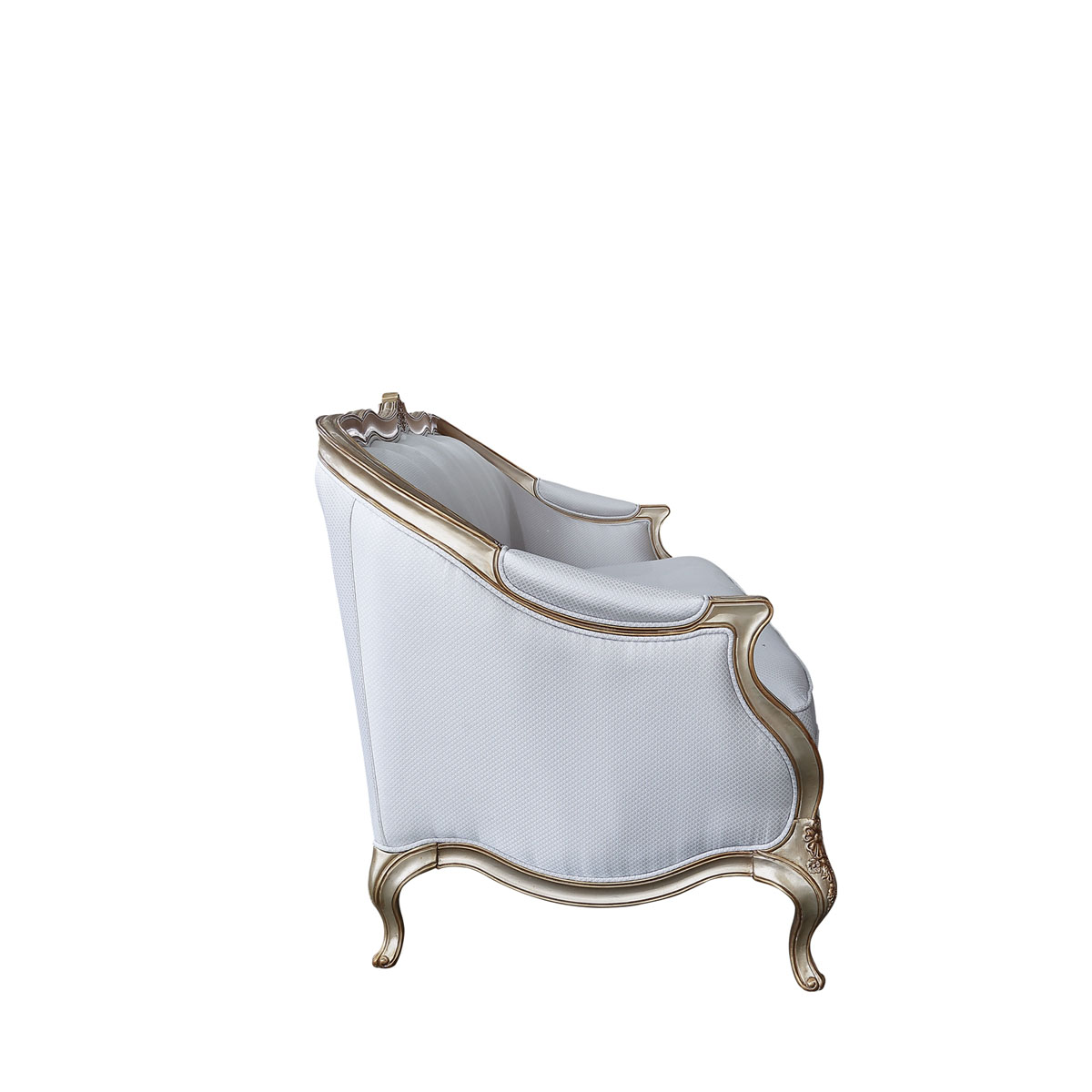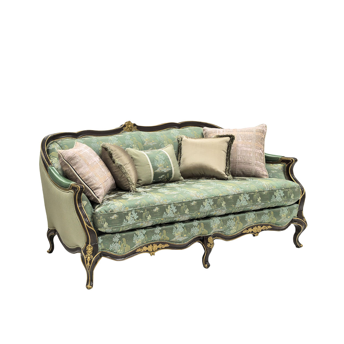* 沙发外形布满手工实木雕刻的花环和卷叶图案 ; * 6只弯形雕刻脚 * 沙发前方、坐垫及背部包有丰厚的填充物 ; * 扶手设计源于法式经典翼背椅(Wing Back Chair) ;