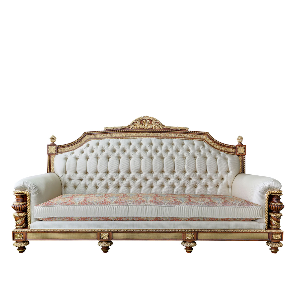 * 以英国温莎城堡中乔治四世时期的卧床为设计意念,使用皇家御用的桃花心木为主要材质,配以精致的雕刻和贴金工艺,表达英国皇室尊贵的地位。同时使用舒适的软包和柔顺的布艺,使艺术和生活结合,表达英国君王客厅应有的品质,是温莎堡系列英式沙发的特色。
