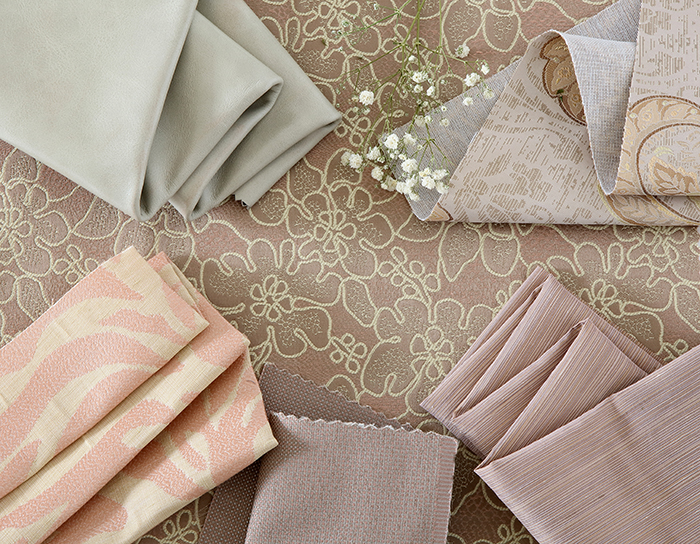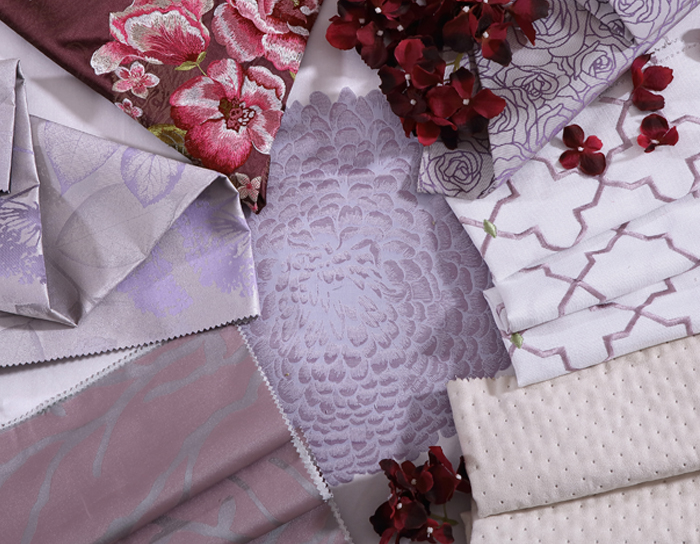 淡黄浅灰为底,樟棕枝叶和香薰色枝藤,以及香槟紫三者构成极为丰富饱满的意境图案,既表现春意缠绵的清新浪漫,也呈现出一种缤纷、张力十足的视觉感官。在空间整体造型上,不仅达成一致性,色调之间也容易形成均衡的美感。